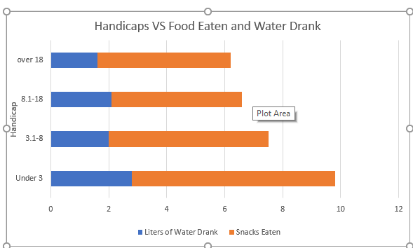 One trend which was consistent in the answers to this survey is that the healthier a golf ate and the amount of water they drank had a correlation with handicaps. Here is a Graph of handicaps vs amount of times snacks were eaten around combined with how much water they drank.